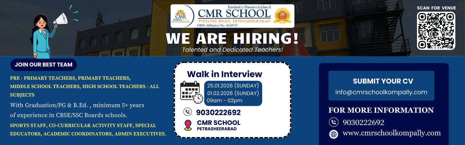 CMR School Kompally offers education from Pre-Primary (Nursery, PP1, PP2) to Secondary (Grade VI – VIII).
